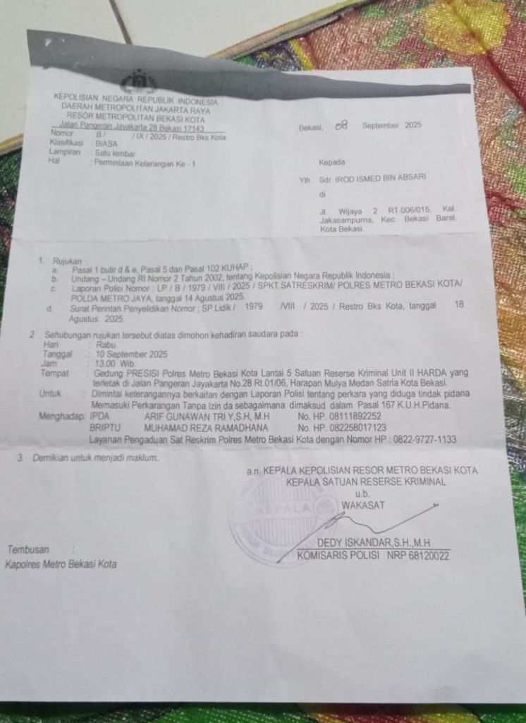 Surat panggilan bernomor B/…./IX/2025/Reskrim tertanggal 8 September 2025 itu menyebutkan, Irod diminta hadir pada Rabu, 10 September 2025, pukul 13.00 WIB, di Gedung Presisi Polres Metro Bekasi Kota.