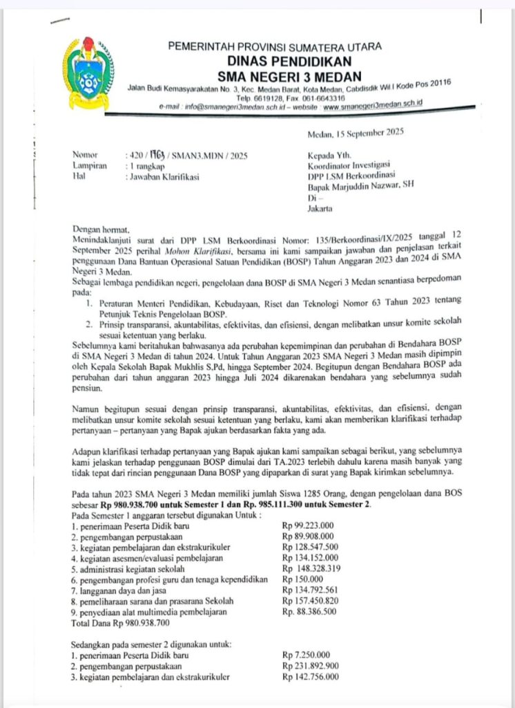 Menurut koordinator wilayah Sumatera Utara Samsir surat permintaan klarifikasi tersebut sudah dijawab oleh kepala sekolah melalui surat resmi dengan nomor 420/1763/SMA3.MDN/2025 tertanggal 15 September 2025.