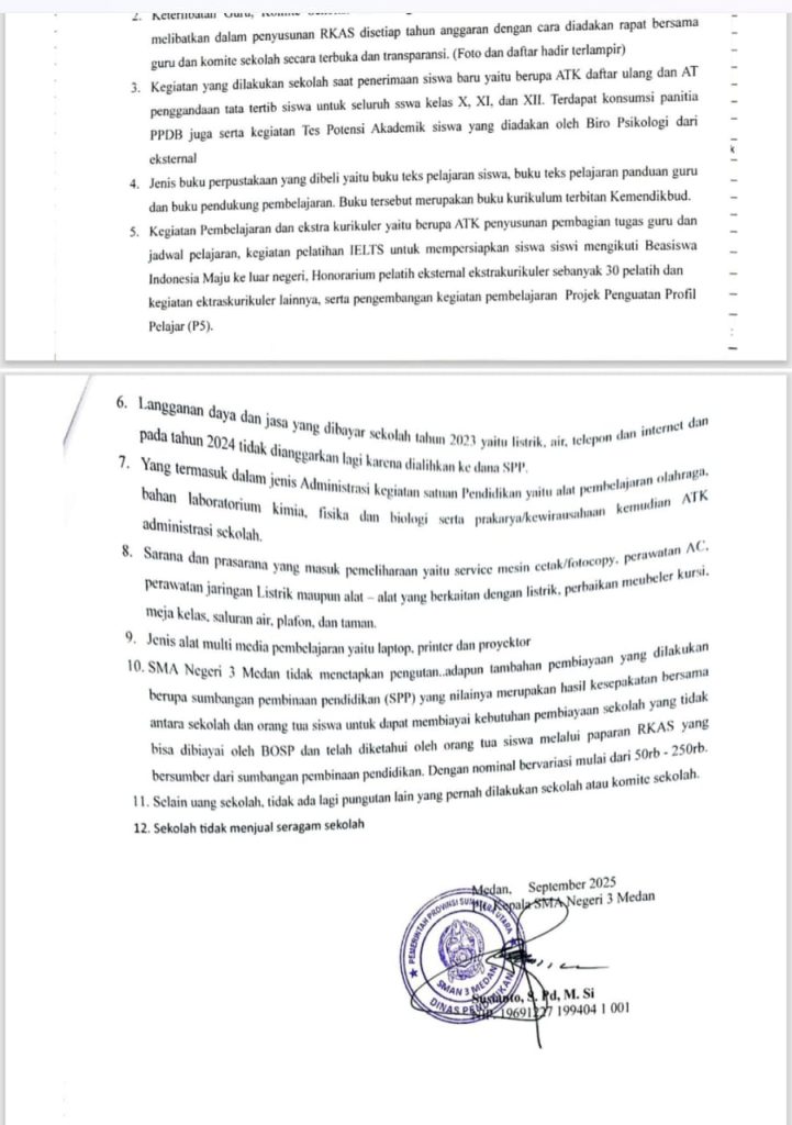 Penggunaan dana Bantuan Operasional Satuan Pendidikan (BOSP) tahun 2023 dan 2024 di SMA Negeri 3 Medan diduga banyak do Mark up dan tidak sesuai dengan fakta dilapangan.