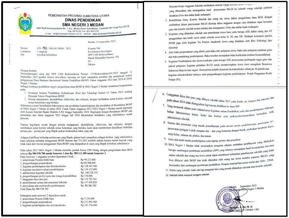 Demikian disampaikan koordinator wilayah LSM Berkoordinasi Samsir menanggapi dugaan penyelewengan dana Bantuan Operasional Satuan Pendidikan (BOSP) yang terjadi di SMA Negeri 3 Medan tahun anggaran 2023 dan 2024.
