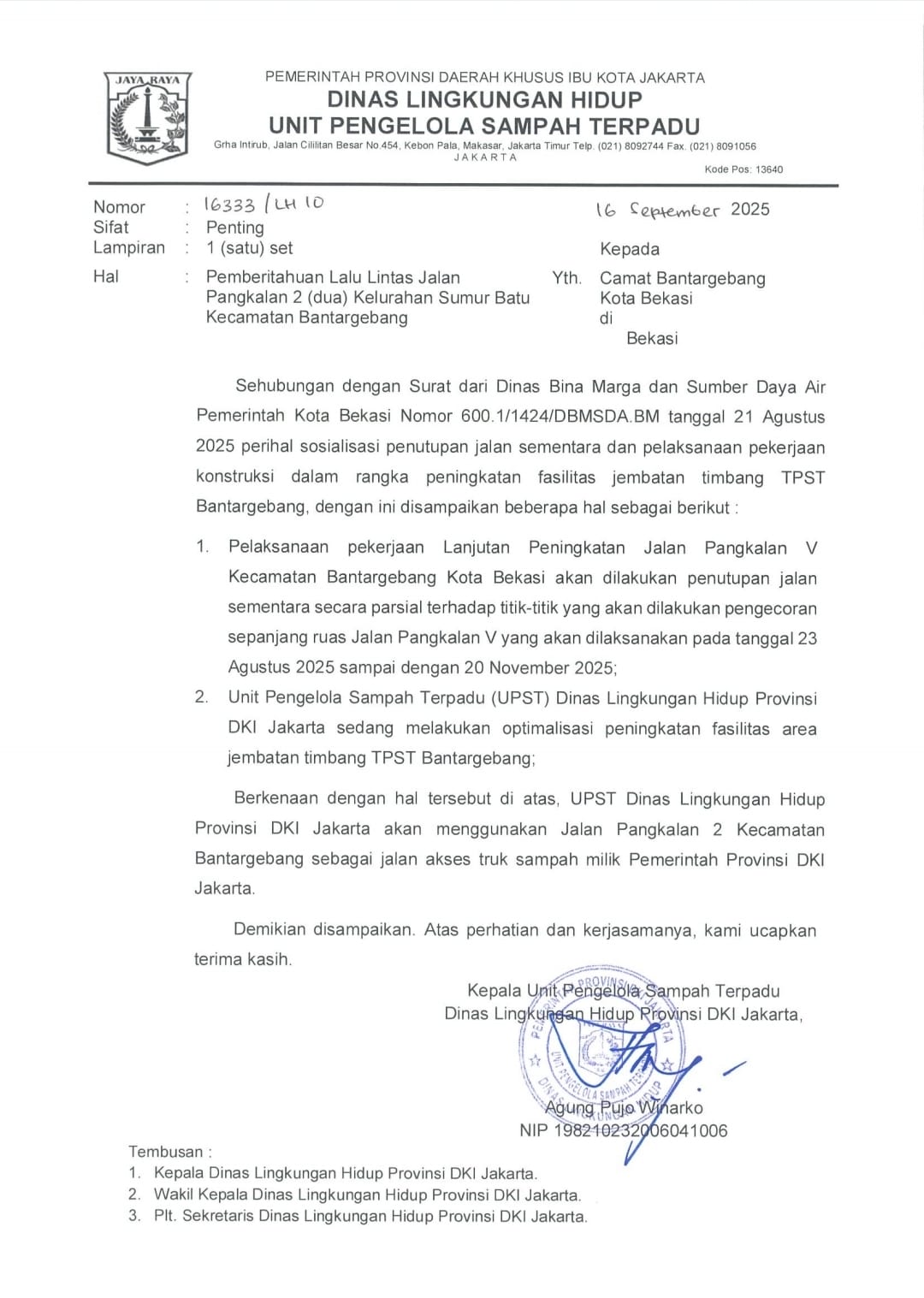 Polemik jalur keluar truk sampah milik Pemprov DKI Jakarta di TPST Bantargebang memasuki babak baru. Setelah ramai diberitakan di berbagai media tentang truk-truk DKI yang melintas keluar melalui Jalan Raya Pangkalan 2, tiba-tiba saja belum enam jam sudah muncul sebuah surat resmi dari Unit Pengelola Sampah Terpadu (UPST) Dinas Lingkungan Hidup (DLH) DKI Jakarta yang ditujukan kepada Camat Bantargebang.