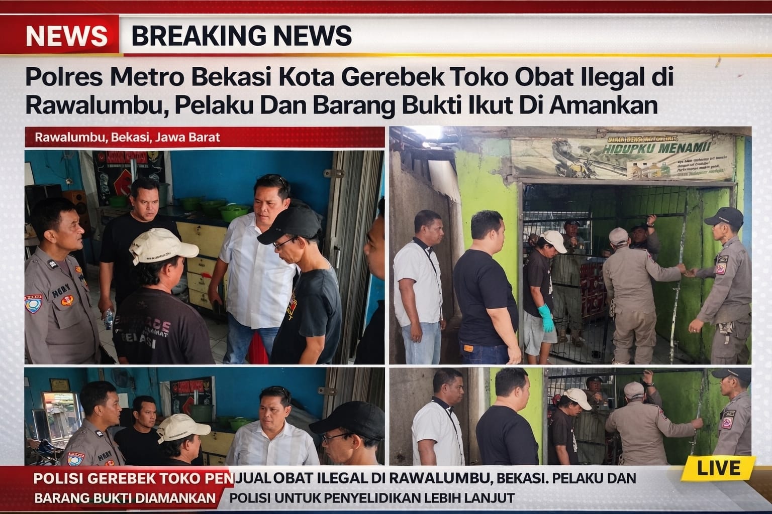 Satuan Reserse Narkoba Polres Metro Bekasi Kota melakukan penggerebekan terhadap sebuah toko obat yang diduga memperjualbelikan sediaan farmasi tanpa izin resmi. Operasi berlangsung di Jalan Caringin, Kelurahan Bojong Rawalumbu, Kecamatan Rawalumbu, Kota Bekasi, pada Kamis (26/3/2026).