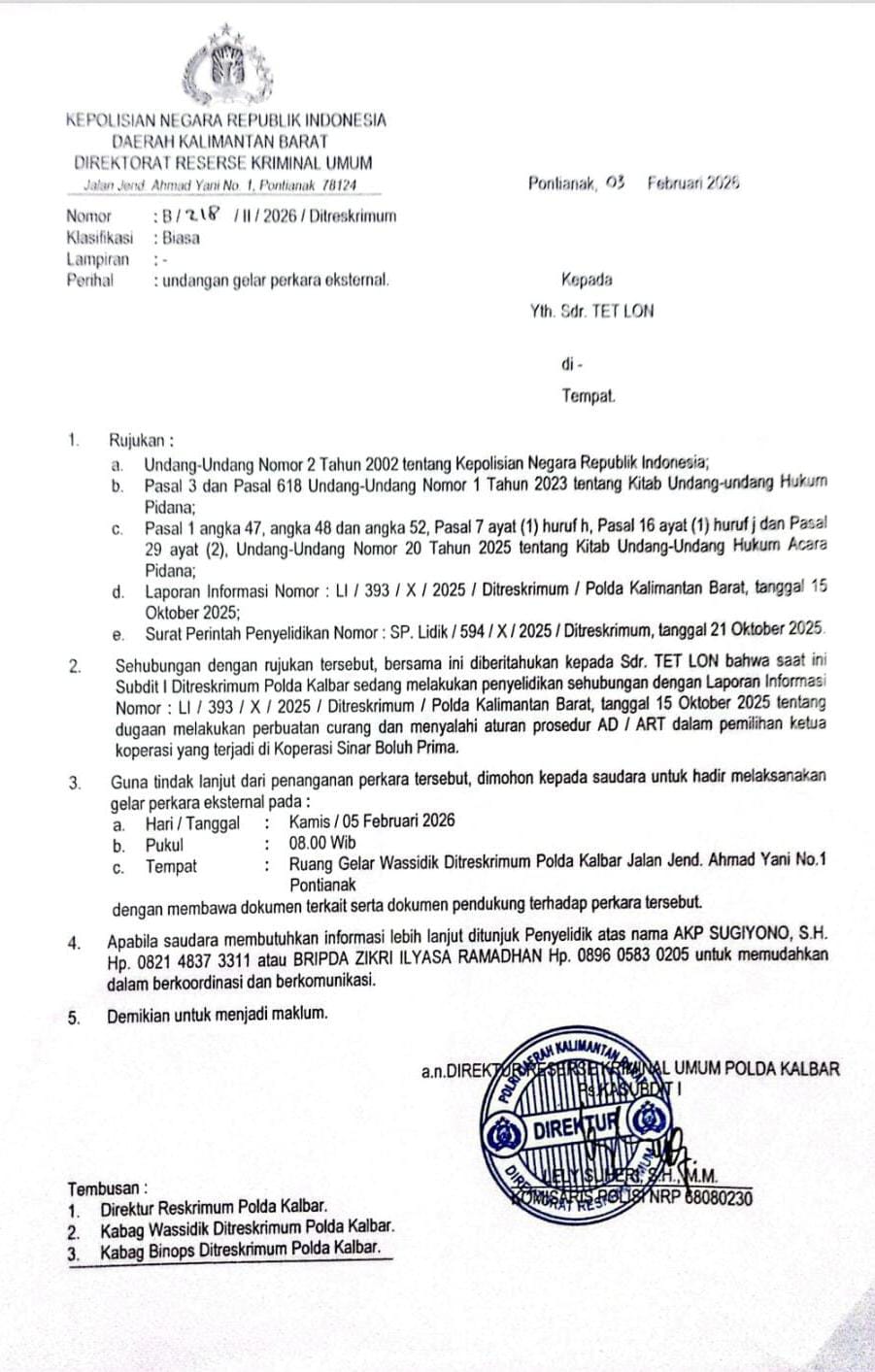 Hal tersebut dikatakan oleh Arbudin selaku Ketua LSM Somasi kepada awak media hari ini setelah menerima laporan langsung dari anggota Koperasi Sinar Boluh Prima (SBP) yang menghadiri gelar perkara kasus ini pada hari Kamis tanggal 5 Februari 2026 kemarin di Polda Kalbar sebagaimana surat panggilan terhadap pelapor Sdr. Tet Lon.